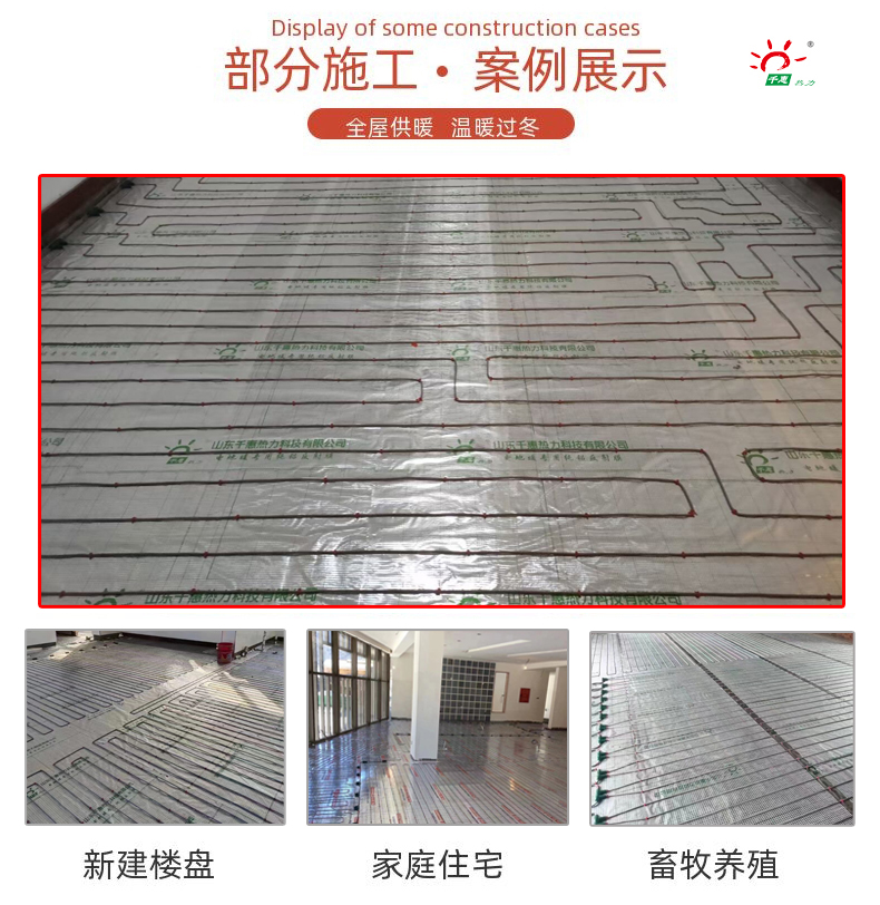 三、【铺设湿铺碳纤维电地暖系统】千惠热力碳纤维地暖系统须按照图纸要求间距铺设在隔热板上,碳纤维地暖发热线应美观、平直,不允许折叠电地暖发热线。